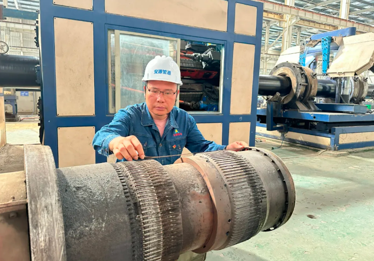 “生產(chǎn)DN400規(guī)格管道時(shí),我們就搶改DN350規(guī)格的模具,充分利用生產(chǎn)間隙,全力投入設(shè)計(jì)繪圖。一旦換產(chǎn),立即拆解模具送改,改完即刻試驗(yàn)!辩娗锩鞲嬖V記者,模具改造最大的挑戰(zhàn)在于,模具拆卸即意味著停產(chǎn)。為兼顧改造與生產(chǎn),技術(shù)部巧妙打起了“時(shí)間差”。這樣的改造過(guò)程持續(xù)了2個(gè)多月,團(tuán)隊(duì)通過(guò)改變內(nèi)、外成型模具結(jié)構(gòu),解決了塑料與鋼絲網(wǎng)熱熔一體成型的品質(zhì)問(wèn)題。